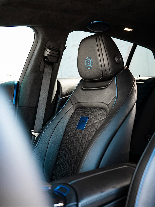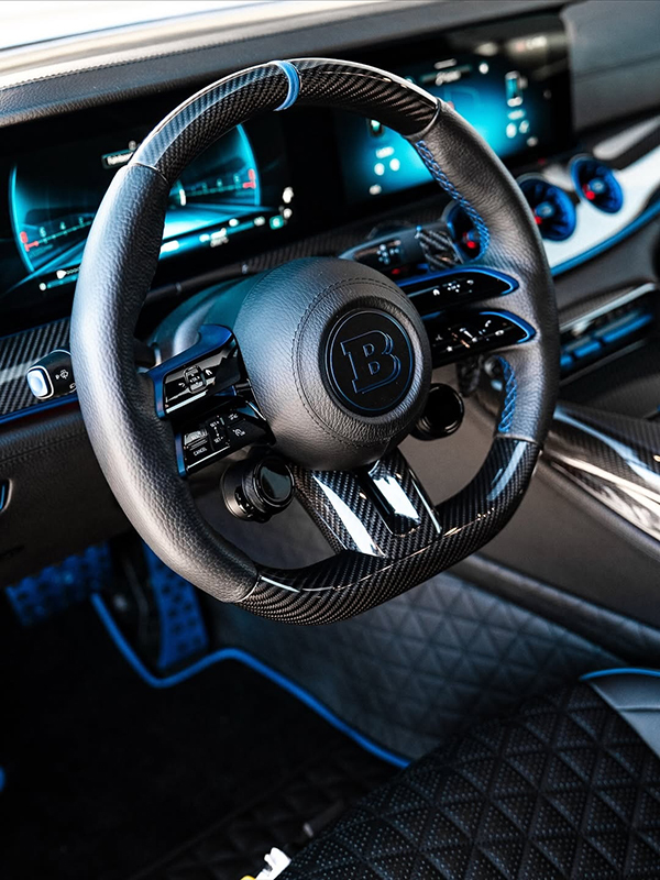 The exterior is presented in blue with a few yellow accents and several naked carbon fiber inserts, and the interior looks quite restrained in comparison, as it features black leather upholstery with blue piping and blue Brabus logos stitched into the headrests. Brabus’ logo is also visible on the steering wheel, which mixes leather upholstery stitched together with blue string and carbon fiber, as well as the air vents, and probably some other components that are not visible in these pictures.