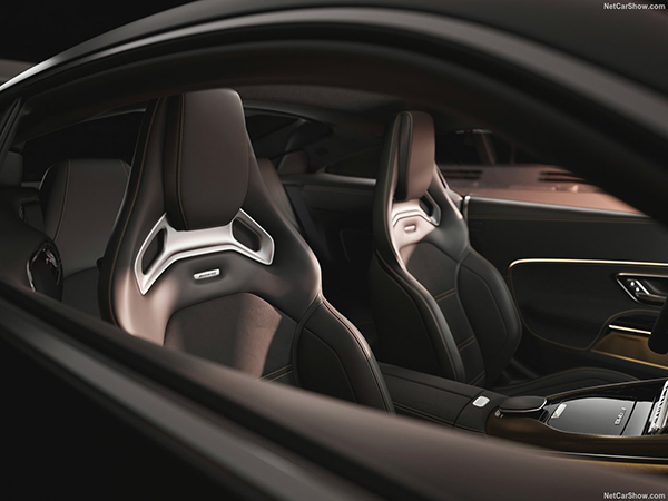 The interior is also characterised by numerous details in race gold. The standard AMG Performance seats are upholstered in black Nappa leather/MICROCUT microfibre and customised with gold-coloured topstitching. The AMG trim elements in carbon fibre with gold-coloured threads harmonise with the heated AMG Performance steering wheel in MICROCUT microfibre with black 12 o’clock markings and race gold-coloured topstitching. This stitching can also be found on the door panels, instrument panel and centre console. The MANUFAKTUR door sill trims with AMG lettering are anodised in black and illuminated in gold. The AMG floor mats in black velour have a leather patch embroidered with the “APXGP” logo in race gold.