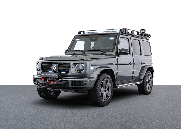This is the configuration of the pictured Mercedes-Benz G 500 (G 550 in our market). It features the Invicto emblems inside and out, special badges, a grille insert, B-pillar logos, an Acetech ECU with SP3, an RFID system, white, red, and dimmable lights on the interior, a heavy duty front winch, a flashing light system, a roof front light bar, auxiliary roof lights, night vision, IR package at the front and rear, a fire extinguishing system, a fresh air system, etc.