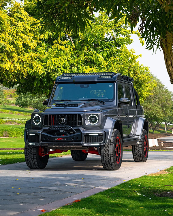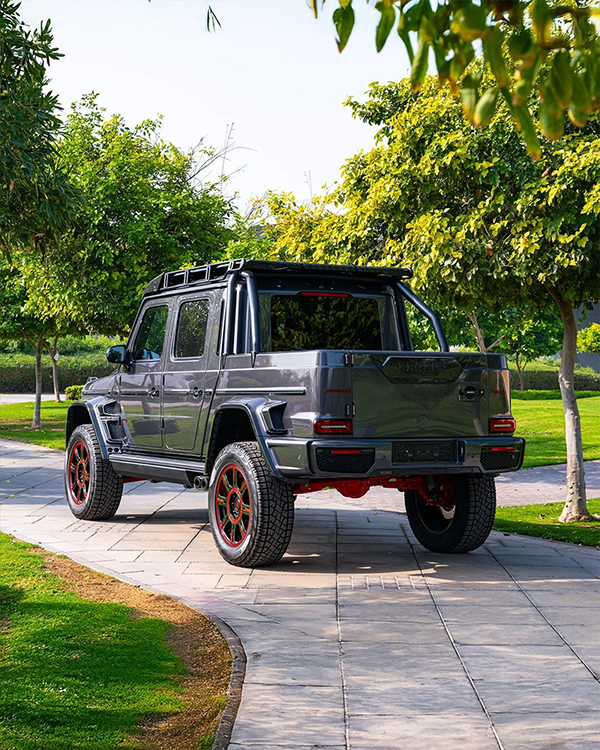 First and foremost, this vehicle, which started life as a very nice Mercedes-AMG G 63, has been turned into a pickup. That’s right, it is no longer a premium-oriented SUV that can cope with the great outdoors, but a pure hauling machine that does not cut back on its luxury amenities. On top of that, it also features portal axles, a jacked-up suspension, a winch, massive tires wrapped around the new wheels, and extra lights for more fun off the beaten path.