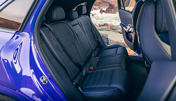 Forget classic Merc restraint: the GLC’s cabin is a riot of technology and sensory stimulation. The 39.1-inch Hyperscreen (three screens under a single sweep of glass) dominates the dash, flanked by Burmester ‘4D’ speakers (using vibrations in the seat for extra immersion), mood-lit jet-turbine air vents, and a full suite of customisable ambient lighting – your kids will love it.