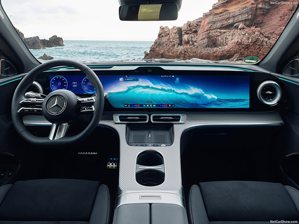 The all-new seamless MBUX HYPERSCREEN creates a holistic driving and spatial experience. This is complemented by up to 11 styles that can be selected as background motifs. The use of colour in the instrument cluster (including the dials and gauges), control elements and ambient lighting is coordinated with these emotional motifs. The impressive ambient styles offer a wide range from calm to intense, cool to warm, and technical to emotional. The striking design is notable for its exceptional aesthetics and precision as well as intuitive user navigation. This allows users to create a personal atmosphere in the vehicle where physical and digital worlds blend seamlessly thanks to MB.OS.