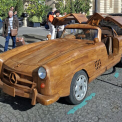 At first glance, it looks like a classic Mercedes-Benz 300 SL Gullwing. Long, elegant, and unmistakably 1950s. But look closer, and the metallic gleam of the original is gone. In its place, polished teak glows under the light, its grain tracing the car’s famous curves. …