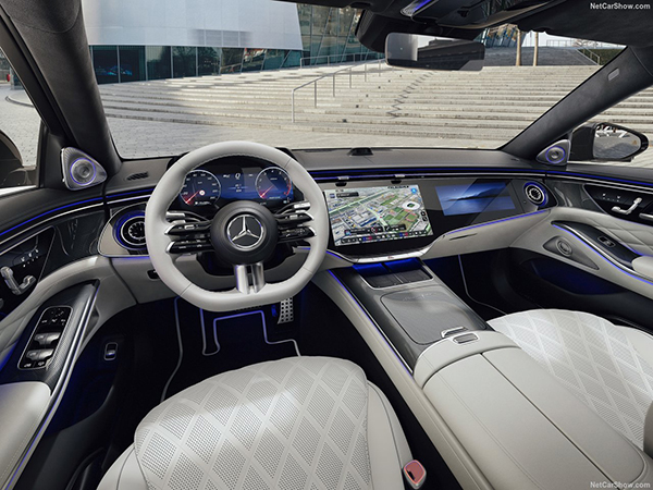 The new DIGITAL LIGHT twin-star headlamp design not only creates an iconic look day and night, but also enhances visibility, helping drivers feel more confident on any road. At the rear, newly designed taillights with three chrome-framed signature stars reinforce the S-Class identity, ensuring a lasting impression. For added distinction, an integrated light projector in the side sill trim casts the “Mercedes-Benz” lettering as a lighting scheme next to the car, greeting passengers and turning every entry and exit into a special moment.