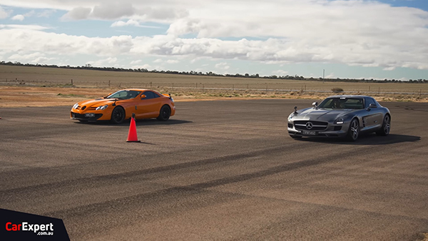 The man lent his Papaya Orange example to the car experts from CarExpert for a drag race. But what to put against this phenomenal machine from the early 2000s? Another symbol of German engineering, the very first AMG automobile to bear the tuner’s badge on its own, without the Mercedes-Benz lineage: the SLS – the gullwinged speed halo car meant to step in the SLR’s tracks.