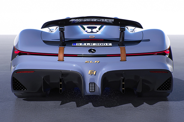 It’s “inspired by the legendary Mercedes-Benz 300 SLR that won the famous Mille Miglia race in 1955 by Stirling Moss,” but the virtual artist also infused it with a modern style, complete with classic touches. Of note are the wings embedded in the carbon fiber front emblem, the gold Mercedes signature in the starry radiator grille, the tiny LED headlights, and the leather straps holding the hood and bumper both at the front and rear, and more.